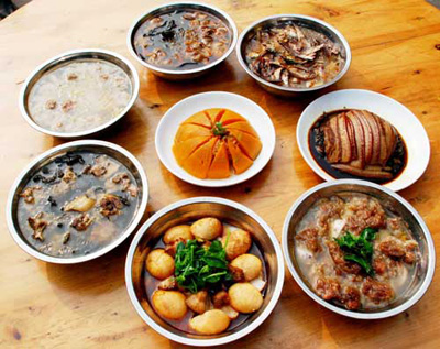 如果說靖港的吃名聞遐邇,有口皆碑,那么,八大碗則是靖港吃之翹楚,也是古鎮(zhèn)人引以為榮的傳統(tǒng)名牌。從前靖港街上數(shù)十家有名餐館,都把八大碗當作各自的招牌菜,各餐館的廚師也都是潛心研習,精益求精,把烹制出高水平的八大碗當作看家本領。曾經(jīng)繁榮昌盛的“小漢口”靖港,那些停船上岸的船夫,載貨而來的生意人以及慕名而來的浪人,首先就得進餐館吃八大碗,飽其饞吻,享其口福,乃至為了貪吃八大碗而“船到靖港口,順風也不走。”而靖港街上的紅白喜事,也是非八大碗不成宴席。