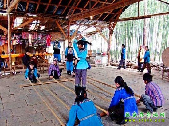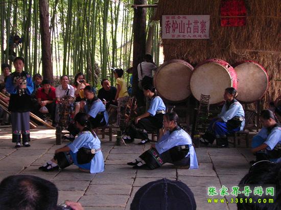 進入鳳凰香爐山苗寨必須過三道關:一是去剿匪,二是對山歌,三是喝三碗米酒。如果過不了這三道關,是不能進寨子的。剿匪就是過一道山洞(當年土匪躲藏的地方),也就是拍攝電影《湘西剿匪記》的現(xiàn)場,洞內(nèi)驚險崎嶇,道路難走,還要過一條河,河面上的橋是用小木板釘成,僅一米寬,上面滴水,橋上很滑,橋下流水很急。