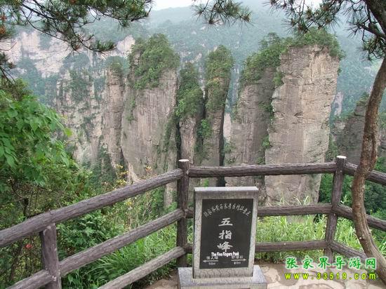 “橫看成嶺側(cè)成峰”,換一個(gè)角度來看摘星臺(tái)上望到的那一片山峰。其中五支石峰一字排開,形狀好像手指。當(dāng)?shù)厝苏f這是如來佛的手指——其實(shí)更像我們自己的手指,我們相象中的手指,大自然的“手指”——這些美景、奇景,本來就是出自大自然之手。