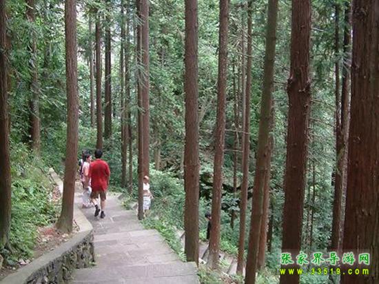 這一大片杉樹林是由張家界國營林場(張家界國家森林公園的前身)工人們種植的。過去“大煉鋼鐵”運(yùn)動(dòng),差點(diǎn)把張家界的山頭全部變成了光頭。后來,一些林場工人抱著“頭發(fā)白在張家界,牙齒掉在張家界,死了埋在張家界”的決心,“獻(xiàn)了青春獻(xiàn)終身,獻(xiàn)了終身獻(xiàn)子孫”,發(fā)誓要植樹造林,綠化張家界。幾十年過去了,許多人綠了青山白了頭,他們的心愿終于變成了眼前的現(xiàn)實(shí)。腳下這條彎彎曲曲而又平平整整的游道是20世紀(jì)80年代修建的。漫步其上,山風(fēng)陣陣、鳥雀聲聲、奇花朵朵,群峰在樹林中若隱若現(xiàn),很有“蟬鳴林逾靜,鳥鳴山更幽”的幽靜與“采菊東籬下,悠然見南山”的悠然。