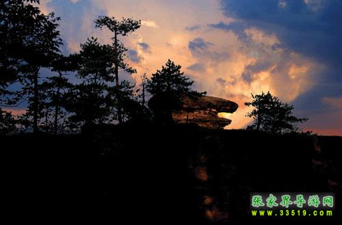 從黃石寨頂西邊下山時(shí),后卡門邊一頂部呈平展臺(tái)面的石峰上,一只長(zhǎng)約5米的石龜頭部向前,作爬行狀。晴天,龜巖呈金黃色,故稱金龜。氣候的變化又可使其呈現(xiàn)各種不同顏色和形狀,故它又有“霧海金龜”、“金龜探海”、“落日金龜”等幾個(gè)別名。