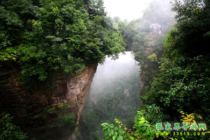 醉月臺西去兩百余米,有一座50多米長,15米厚的條石搭在兩座山峰之間,其下嵌空350多米,這就是名聲赫赫的天下第一橋。橋約20米長,最薄處約4米厚,最窄處只有2米多寬。與兩邊橋墩合為一體,天衣無縫。橋面兩側(cè)、橋頭兩壁上端均有綠樹簇?fù)?,郁郁蔥蔥,而橋下洞壁宛若刀削,草木不生。望橋臺有三處,其一在橋邊20米處,俯視橋面,但見兩側(cè)綠叢中間,一段平路通向彼峰,橋洞依稀,下端被密林遮住,往來其間,無甚驚險(xiǎn)。其二在橋左側(cè)30多米處的石壁上,透過樹枝向右下俯視,可見橋洞側(cè)面一部分,不知其下幽深幾許,若逢雨后初晴,有云霧在眼前突涌,亦不明其由來。最扣人心弦的是繞過右邊長達(dá)1200多米的“U”形深谷,隔200余米的澗谷向東觀賞,橋面橋洞,橋壁橋底,一覽無余。它造型巍峨,偉岸雄奇,高峻深險(xiǎn),形神逼真,確屬大自然神工鬼斧之杰作。