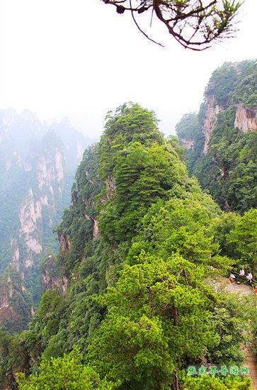 憑欄環(huán)望,諸峰拱立,百態(tài)千姿,近在咫尺。天氣凈朗時候,山石節(jié)理,松柏古木,依稀可辨。欣賞奇峰高崗,我們或者因?yàn)橹荒苓h(yuǎn)觀,或者因?yàn)樯碓趶]山難識其真面目,一步登天能夠給你一個細(xì)細(xì)玩賞的機(jī)會?;赝哌^的楊家界,層巒疊嶂,濃淡相宜,眺望,黃獅寨、張家界……若隱若現(xiàn),秀色可餐。