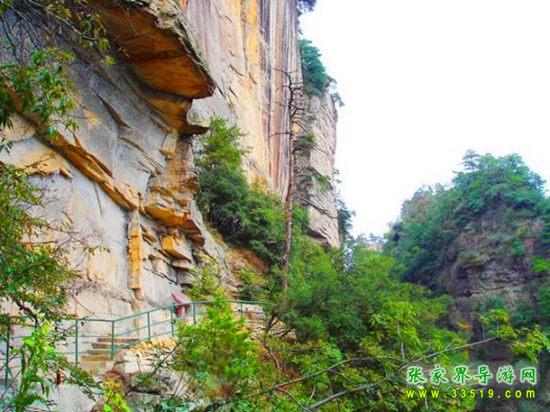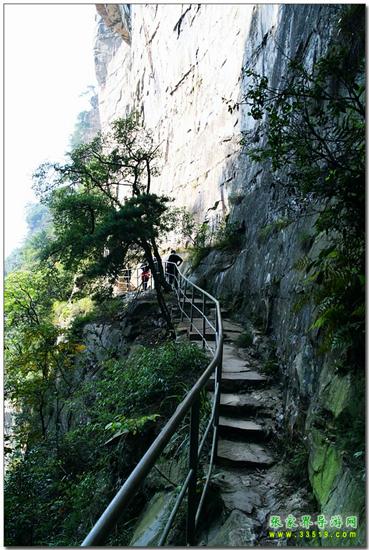 由群仙開(kāi)宴景點(diǎn)沿石徑蜿蜒而下約200米處,一巨峰于半腰分裂,內(nèi)可行人,長(zhǎng)300米,寬0.1-1米。南側(cè)懸崖峭壁,深不見(jiàn)底。北側(cè)石壁高50米,抬頭不見(jiàn)其頂。人行其內(nèi),如置身空中長(zhǎng)廊。廊中虬松懸崖,亂云飛渡,山風(fēng)呼嘯。廊之東、南和西南三面峰立如林,或如城墻,或加堡壘,各呈奇舉。