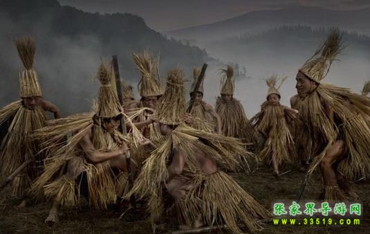 茅古斯雖然還不是成熟的戲劇形式,但已有模擬遠(yuǎn)古先民勞動和生活的故事情節(jié),并通過舞蹈、道白來表達(dá)內(nèi)容。通常由15人表演。表演者頭戴尖頂齊脖茅草帽,頭扎草辮,全身皆用稻草包扎,象征全身都長著毛的先民。演出時,有簡單布景,由一人領(lǐng)舞出場,茅古斯數(shù)人尾隨歡跳,抖動全身稻草,搖晃頭上草辮,以變嗓對話歌唱。表演內(nèi)容有刀耕火種、圍獵、捕魚、接新娘、先生教書、甩火把等。茅古斯表演從形式到內(nèi)容,都別具一格。演出自始至終講土話、唱土歌,但以對白為主體,觀眾也可答話插白。演員或歌或舞,或蹦蹦跳跳、翻跟斗、做游戲。或碎步進(jìn)退,曲膝抖身,左跳右擺,搖頭聳肩,全都是模仿古人粗獷的憨態(tài)。形態(tài)滑稽,詼諧有趣。