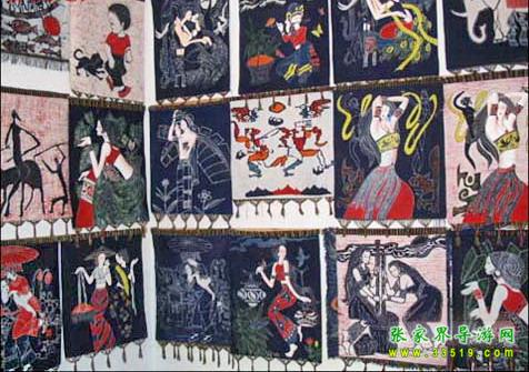 織錦。又名“西蘭卡普”、“土花鋪蓋”,為土家族傳統(tǒng)工藝品之一,是森林公園工藝品廠的主要產(chǎn)品??楀\是在特制的本質(zhì)織機上以錦紗為經(jīng)、五彩絲線為緯、手工提花織成。以其質(zhì)地厚實、堅韌,色彩鮮艷,格調(diào)古樸,流暢生動著稱。圖案有花草、鳥獸、生產(chǎn)、生活、幾何、字樣等種類。為舊時土家姑娘必備嫁妝之一。據(jù)考證,早在漢代,土家織錦就作為方物貢入漢室宮廷。20世紀(jì)后,土家織錦曾漂洋過海至日、美、英等國展出,并作為禮品,被國家領(lǐng)導(dǎo)人贈送給外國元首及政府官員,如今織錦以壁掛、枕巾、沙發(fā)墊、桌圍、提袋、服飾等多種式樣遠(yuǎn)銷世界各地。