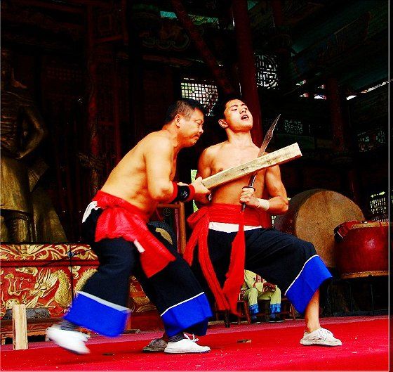 大庸氣,堪稱武林奇葩,曾為祖國(guó)贏得聲譽(yù),海內(nèi)外享有極主名望。 大庸氣功是大庸各民族特別是土家族傳統(tǒng)體育項(xiàng) 目之了,分健體氣派、武術(shù)氣功兩類。前者有“返還 功”、“馬王推氣功”、“少林達(dá)摩醫(yī)療保健氣功” 等;后者有靜坐、壁虎、靈子、二指彈、碎石、松靜 、硬氣、五禽、五陽(yáng)功等,尤以硬氣功著稱。大庸硬 氣功,歷史悠久,漢代相單程,明代覃后,清代劉明 燈,當(dāng)代湯子模、周鐵鞭、杜心武、趙繼書等都具有 超人硬氣武功。大庸土著民族在漫長(zhǎng)的反征服、反壓 迫斗爭(zhēng),博采武當(dāng)、少林南北派、昆侖派眾家武林精 華,創(chuàng)造出獨(dú)此一家的大庸硬氣功。 據(jù)傳,大庸硬氣功鼻祖是楚國(guó)鬼谷子?!队蓝h 志》有關(guān)鬼谷子隱居天門山鬼谷洞潛心學(xué)《易》、傳 授方術(shù)的記載。到清代有武林高手朱茂嶺,隱居三岔 村北芭蕉灣洞,研究鬼谷氣功之術(shù),后收西溪坪胡口 子、余世萬(wàn)(即“余通人”)為徙,傳其衣缽。余通 人將武術(shù)氣功系統(tǒng)整理,發(fā)揚(yáng)光大,播名于世。 新中國(guó)成立后,黨和政府十分重視民間氣功發(fā)掘 整理,并正式列為體育項(xiàng)目加以普及發(fā)展,今日大庸 市習(xí)練硬氣功達(dá)數(shù)萬(wàn)人眾。永定區(qū)官黎坪村世有“硬 氣功之鄉(xiāng)”盛譽(yù),該村男女老幼,練功已蔚成風(fēng)氣, 其武師趙繼書,1979年先后參加全省和全國(guó)武術(shù)大賽 ,均獲一等獎(jiǎng),受到國(guó)家體委重視,同年7 月趙繼書 專程到北京給中央領(lǐng)導(dǎo)同志匯報(bào)表演。嗣后,隨同中 國(guó)武術(shù)代表團(tuán)和國(guó)家領(lǐng)導(dǎo)人先后兩次出國(guó),到盧森堡 、意大利、比利時(shí)、羅馬尼亞、馬其他和東南亞等國(guó) 家訪問。他表演的臥刀碎石、頭頂開石、雙鳳灌耳、 頭碰石柱、叉尖推磨等精彩節(jié)目,博得外國(guó)友人好評(píng) 。盧森堡一位榮獲國(guó)家獎(jiǎng)牌的武士,看了表演后連夜 來到中國(guó)大使館,將自己珍藏多年的獎(jiǎng)牌贈(zèng)送給他; 盧森堡國(guó)王主動(dòng)熱情走上臺(tái)與趙繼書熱情擁抱,連連 稱贊:“了不起!了不起!國(guó)際氣功大師!”并把珍 藏紀(jì)念章一枚贈(zèng)送給趙繼書。一位法國(guó)朋友十分贊賞 說:“中國(guó)的氣功,稱為全人類的寶貴財(cái)富,是有科 學(xué)道理的。”自此,大庸硬氣功譽(yù)滿全球。湖南瀟湘 電影制片廠專門拍攝了彩色紀(jì)錄片《大庸氣功》。 大庸硬氣功共有二十多個(gè)項(xiàng)目,最有影響的是: 腹臥鋼叉 由二人在地面扶住一根叉尖朝上的三 股鋼叉,叉尖猁鋒利,然后一個(gè)俯身叉尖,尖抵腹部 ,待其四肢平展懸空,扶叉二人轉(zhuǎn)動(dòng)鋼叉,謂之推磨 。表演時(shí),要求臥叉者運(yùn)氣于腹,氣意集中,稍有大 意,叉即穿腹而過。 臥刀破石 先固定兩把大刀,刀口朝上,臥刀者 運(yùn)氣后,由其他人抬臥于刀口上(有仰臥、俯臥兩種) ,然后在臥刀者腹部或背部置一碩大石條(約數(shù)百斤) ,一人或兩人輪大鐵錘狠擊石條直至斷裂破碎為止。 釘?shù)洞财剖?地上倒一層碎玻璃片,一人仰臥其 上;然后腹上置釘床,又一人仰臥釘床上,再于第二 人腹上置釘床,第三人仰臥刀床上,腹部上壓一塊數(shù) 百斤大條石,由人掄錘狠砸,至石破為止。 銀槍刺喉 用一根兩頭安有鋒利槍頭的鋼槍,抵 置兩位表演者喉部,然后相對(duì)發(fā)力,至槍桿抵成彎弓 形而喉部安然無恙。 徙手?jǐn)嗍?表演者將堅(jiān)滑如鐵一塊卵石置于石凳 (地)上,然后運(yùn)氣于掌或指擊斷(碎)卵石。 踢腿斬石 表演者運(yùn)氣于腿,以腿踢斷石條。一 般可踢斷15公分以上厚度的麻石條或青石條。 胸部打刀 將鋒利大刀刃口置于胸部肌肉上,用 一根拳頭粗木棒猛擊刀背,至棒斷而胸部無傷。 新中國(guó)成立以來,大庸民間武術(shù)與民族體育逐漸 融為一體,發(fā)揮著提高人民身體素質(zhì)、弘揚(yáng)中華武術(shù) 傳統(tǒng)和增進(jìn)國(guó)際友誼重大作用。除硬氣功外,還有數(shù) 十種武術(shù)形式散見于民間武術(shù)體育活動(dòng)之中。如打飛 棒、扭扁擔(dān)、抵搭斗杠、擠油渣、甩抱腰、舉石鎖、 板牛角(一種斗牛形式)等等。其特點(diǎn)是因地制宜, 不分場(chǎng)地,凡田園地角院壩集鎮(zhèn),都是習(xí)武練功、開 展活動(dòng)的處所,頗具泥土氣息。擬或以生活中某些動(dòng) 作和動(dòng)物的某種形態(tài),稍加模仿演繹,便成某一獨(dú)特 武術(shù)形式。如天門武術(shù)功夫大師余道人所創(chuàng)造的“宮 天梳”、“巖燕樸天門”等;也有就地理特點(diǎn)創(chuàng)造某 種武功形式的,如“蕩藤”等。
