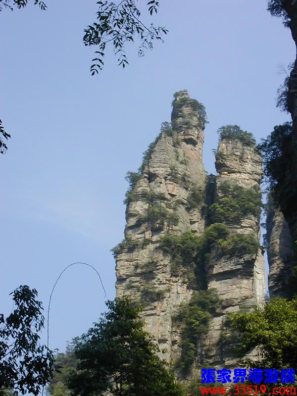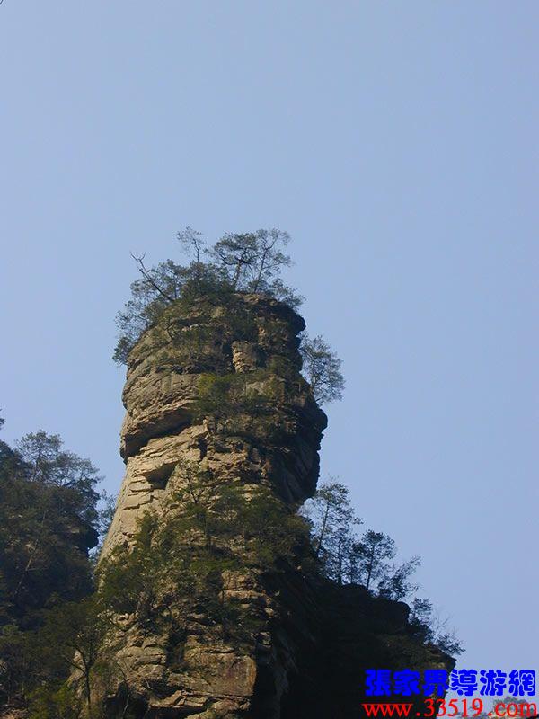 (金鞭巖、神鷹護鞭)如果要問張家界國家森林公園的標志景點,答案是現(xiàn)成的:金鞭巖。早在清代中期,一些文人就把張家界的峰林及百丈峽列入“永定八景”。其一叫“危峽啼猿”;其二叫“層巖涌塔”:“縣西二十里青崖山,其前五山并立,層峙如浮圖。中一峰更峻拔,上插宵漢,晴輝雪積,最擅奇觀。”這里說的“其中一峰”,指的金鞭巖。八大景點張家界占其二,可見先人是有眼力的。金鞭巖相對高度380多米,拔地而起,直插云霄,無論你遠看近看,正看側(cè)看,都是一根刺破青天的長鞭!在金鞭巖左側(cè)的那座巖峰,大家看多像一只兇猛的老鷹,勾嘴瞪眼,雙翅略展,時刻警覺地守護著金鞭,人稱“神鷹護鞭”。