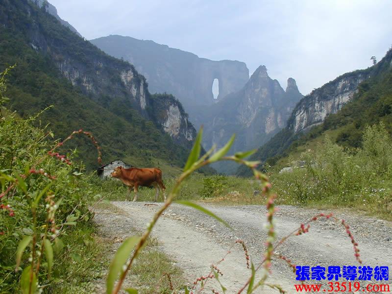 (俯視天門)站在這里可以俯視面向北面的天門洞,以及天門山公司正在修建的通天大道。1999年11月世飛賽期間,中央電視臺6號機組正是在這里拍攝飛機穿越天門驚人場面的。這兒距天門洞垂直高度200多米。