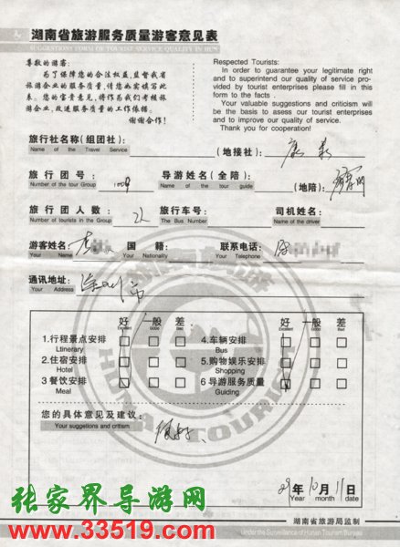 2009年10月9日深圳李先生一行2人質量接待反饋單: