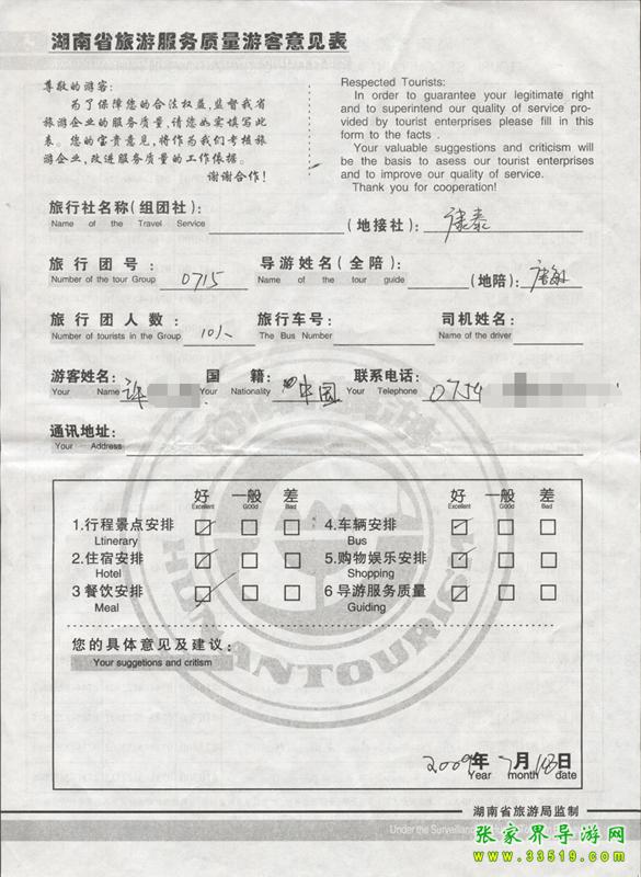 7月15日許先生一行10人張家界旅游質(zhì)量反饋單