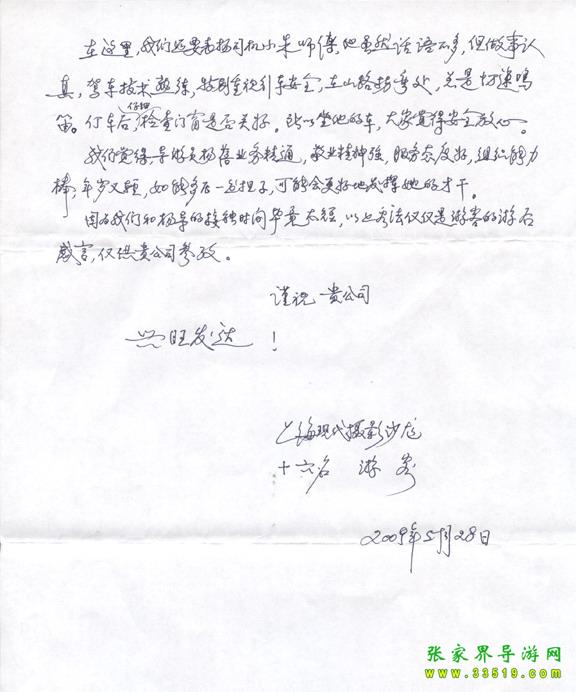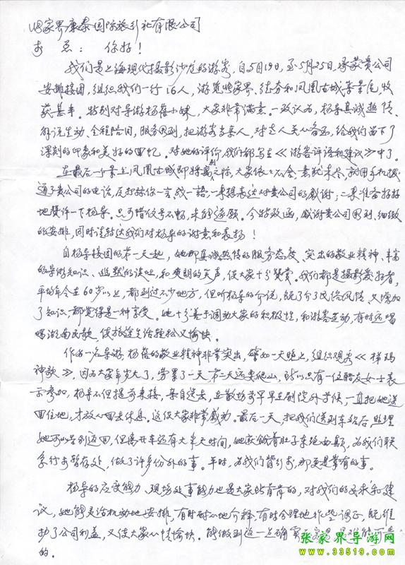 2009年5月19日“上?,F(xiàn)代攝影沙龍”一行16人,參加張家界旅游導(dǎo)游網(wǎng)組織的張家界旅游跟團,于2009年5月25日結(jié)束行程。游玩期間,由于導(dǎo)游楊蓓的出色講解和周到的服務(wù),得到客人的一致好評。客人特寄表揚信一封,如下: