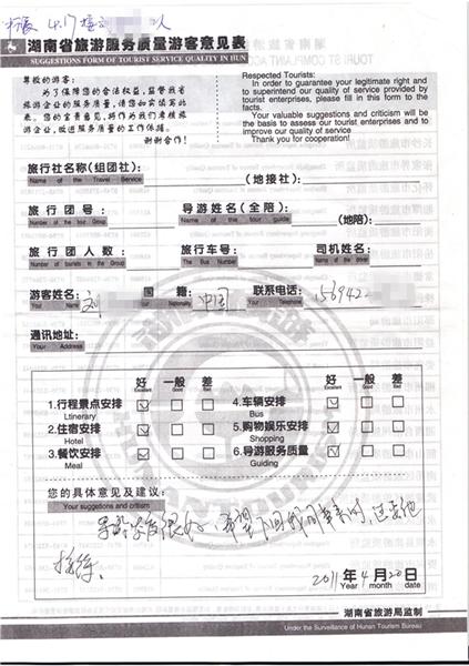 2011年4月22日劉小姐一行2人旅游質(zhì)量反饋:導(dǎo)游態(tài)度很好,希望下次來還要他接待