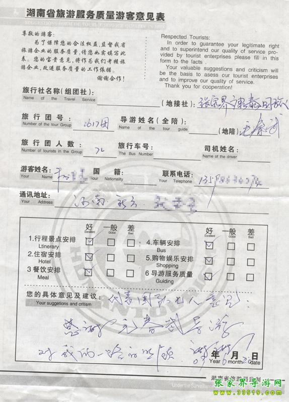 2009年6月17日楊女士一行7人接待質(zhì)量反饋單: