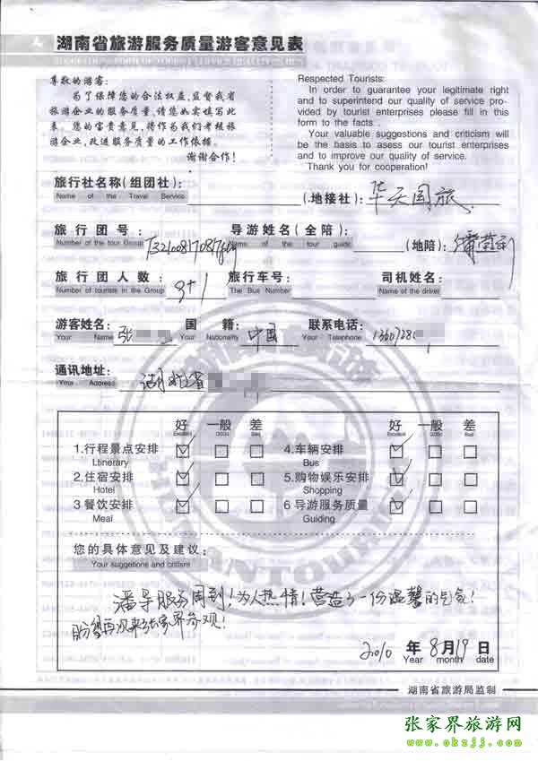 2010年8月19日湖北張先生一行九位旅游點評:導(dǎo)游服務(wù)周到熱情,盼下次再來張家界